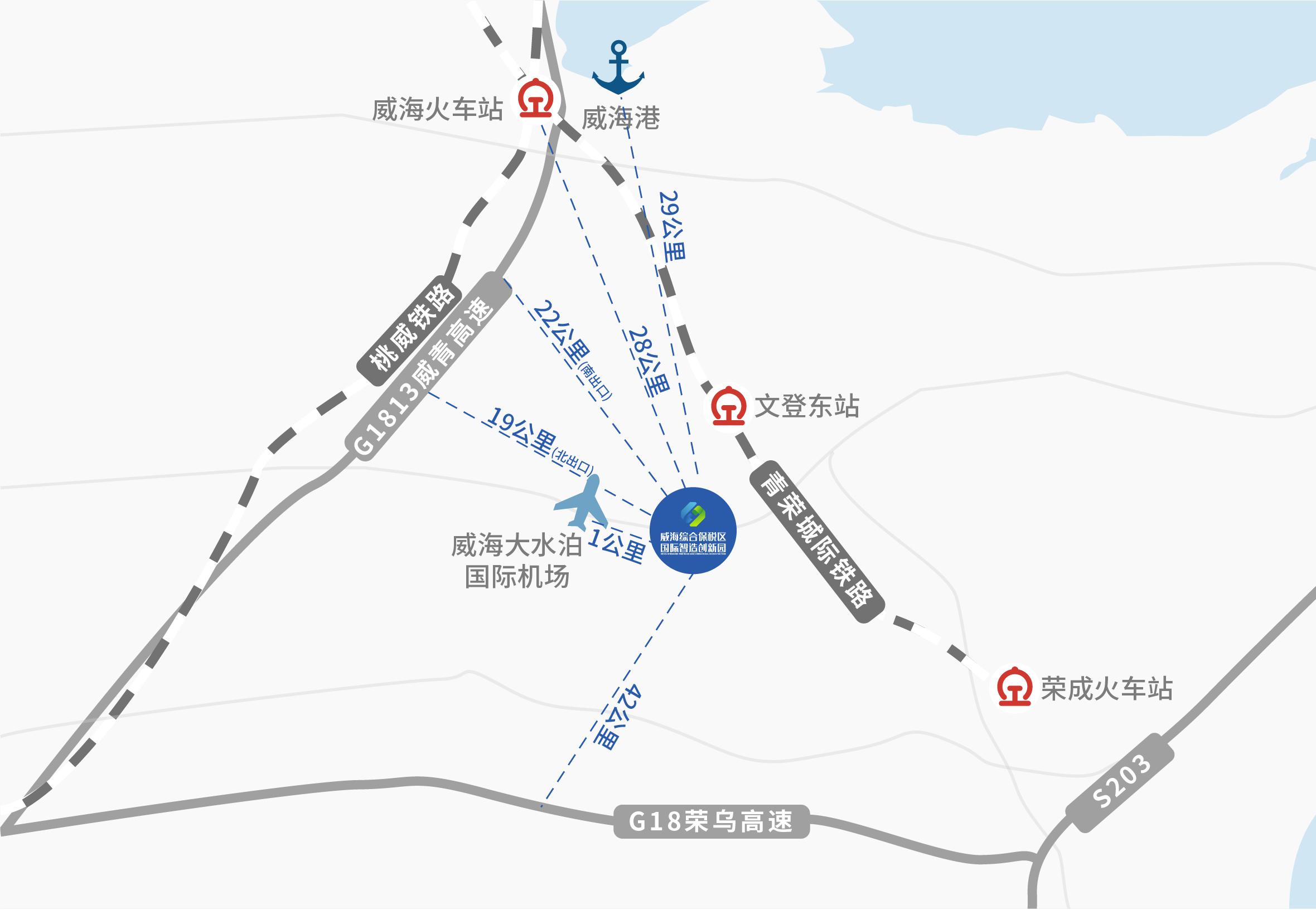 “威海综合保税区国际智造创新园”周边铁路、机场、港口、高速一应俱全、区域内交通高效便捷。